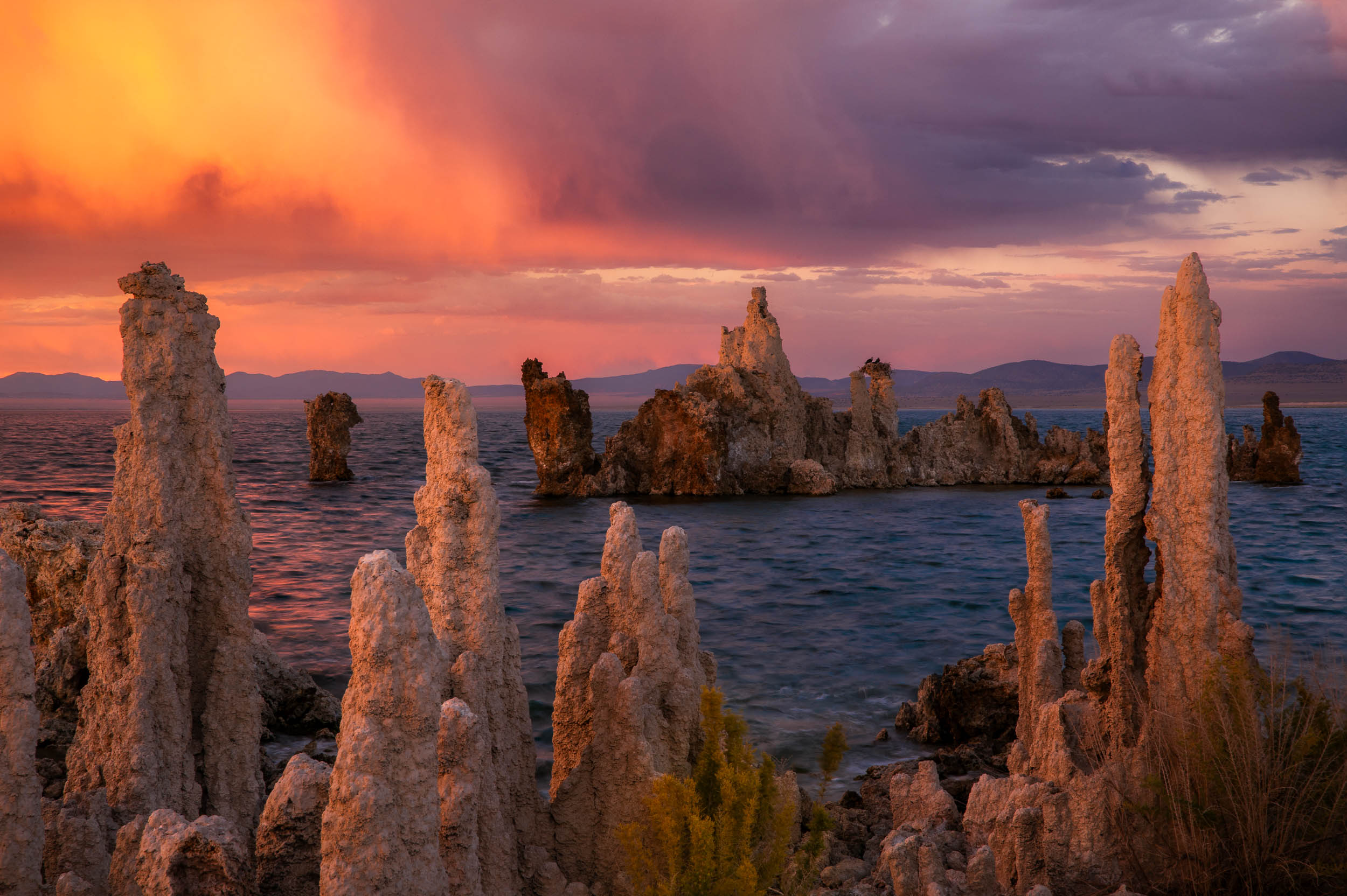 A dying storm passing behind Mono Lake, creating a beautiful sunset glow with the tufas.